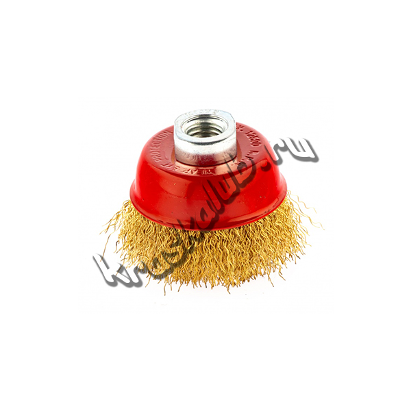 Щетка изготовлена из стальной проволоки. Латунное покрытие. Применяется для очистки металлических поверхностей от ржавчины и грязи в щадящем режиме. Тип посадки – М14.