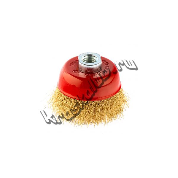 Щетка изготовлена из стальной проволоки. Латунное покрытие. Применяется для очистки металлических поверхностей от ржавчины и грязи в щадящем режиме. Тип посадки – М14.